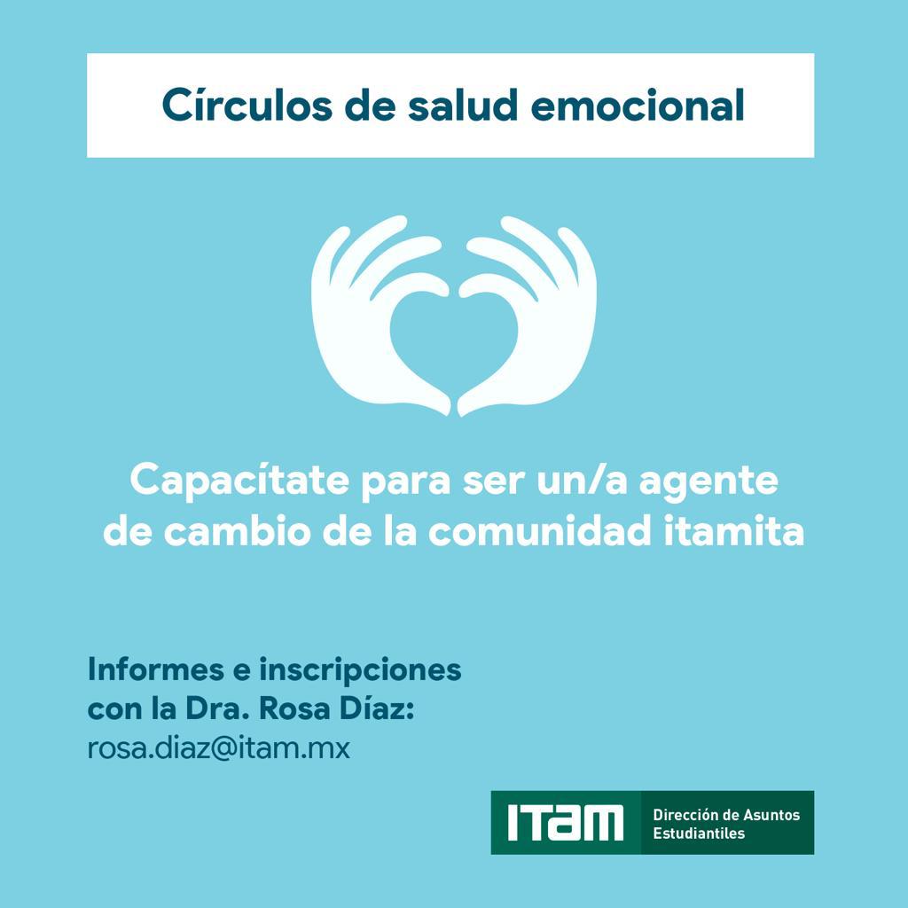 Desde la Dirección de Asuntos Estudiantiles te invitamos al siguiente evento, ven y acompáñanos al segundo circulo de salud emocional. Éste tendrá como propósito la capacitación para ser "agente de cambio de la comunidad itamita" y poder brindar los primero auxilios psicológicos necesarios ante una crisis emocional. ¡Tienes hasta el 12 de marzo para inscribirte! Informes e Inscripciones con la Dra. Rosa Díaz: rosa.diaz@itam.mx ¿Qué son los primeros auxilios psicológicos? “Estrategias de apoyo y acompañamiento en situaciones de crisis para la pronta recuperación del equilibrio emocional” (Ante situaciones de desastre como temblores, incendios, etc. o ante situaciones emocionales derivadas de conflictos interpersonales traumáticos. Esta forma de intervención está diseñada para ofrecer ayuda práctica y no invasiva, poniendo el foco en las necesidades y preocupaciones inmediatas de las personas. Puede ser proporcionada por cualquier persona, sin necesidad de contar con un entrenamiento especializado en el área de la salud mental.